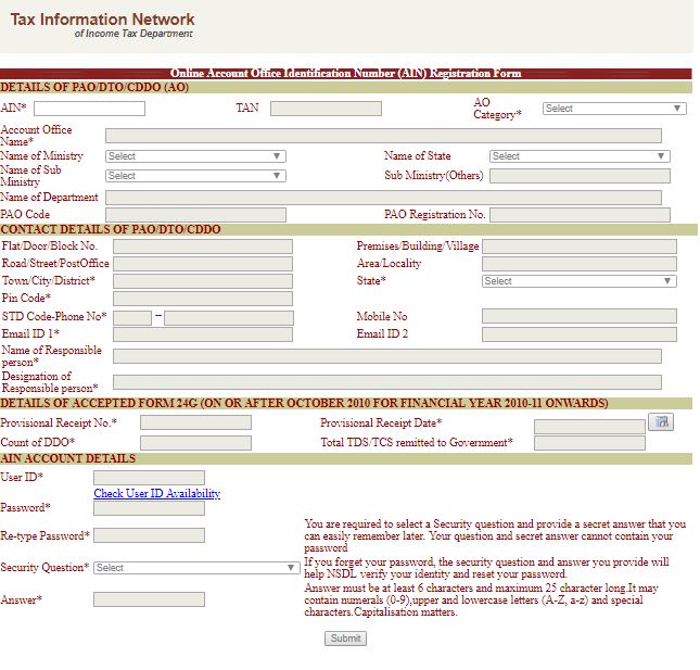 AIN or Account Information Number is a seven-digit identification number which is allotted by the Directorate of Income Tax (Systems). The number is allotted to each Accounts Office (AO). Every Accounts Office must have an account identification number with jurisdictional TDS office for filing Form 24G.