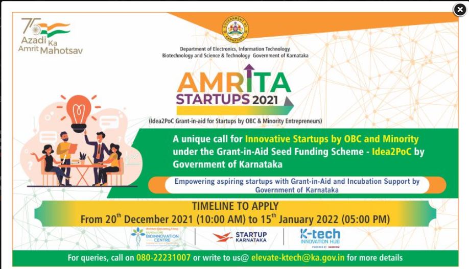 The Government of Karnataka announces a call for proposals under the Amrita Startups Idea2PoC Grant-in-aid Seed funding scheme for innovative Startups by OBC and Minority Entrepreneurs. Amrita Startups applications are open for Grant in aid up to Rs.50 lakh from 20th December 2021 to 15th January 2022. The schemes enable technology innovators and entrepreneurs to pursue a promising technology idea, establish and validate proof of concept (POC) for the idea. The startups,