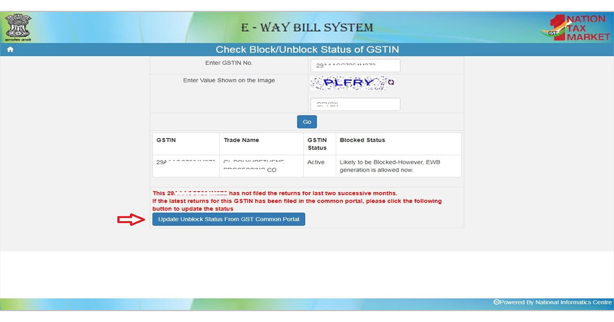 - Click ‘Update Unblock Status from GST Common Portal’ to refresh the status and enable e-way bill generation. If this process fails, taxpayers can seek assistance from the GST Help Desk.
