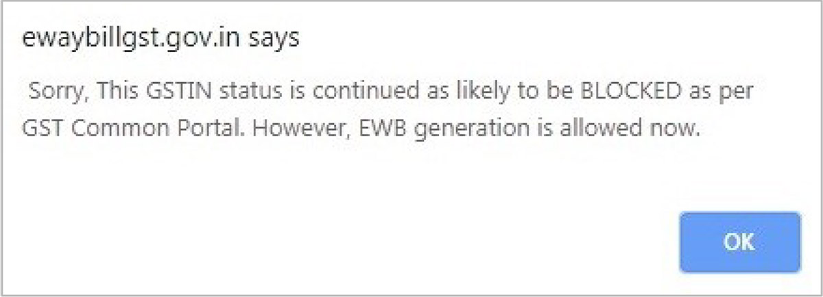 The status of the GSTIN is auto-updated from blocked to unblocked in the e-way bill system when the users file GSTR 3B return in the GST Common Portal. This happens when GSTR 3B is filed in the GST common portal. In case the taxpayers did not file the GST returns for the last 2 successive months and click on the update button a message like this will be displayed.