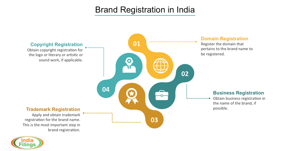 A brand could be a business name, domain name, product name, slogan, logo, term, design or other feature that distinguishes a product or service from an entity from those of others. Branding is a must for all businesses that are into manufacturing of products or providing of services. Brand registration in India involves multiple processes such as domain registration, business name registration, trademark registration and copyright registration, as follows: