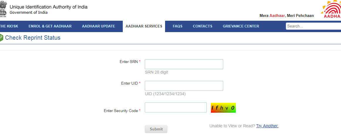 Step 2: Then click on the âOrder Aadhaar Reprint (Pilot Basis)â option from the dropdown list under the Aadhaar services tab. Step 3: You will be re-directed to an Order Aadhaar Reprint page where you have to enter your 12 digits Aadhaar Number or Virtual ID and the security code.