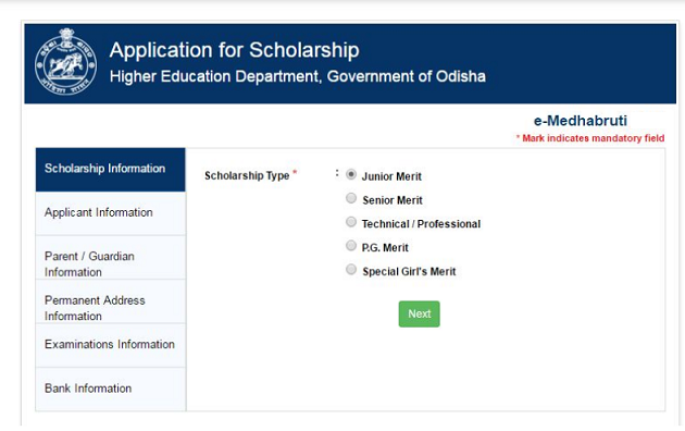 official website of the Higher Education Department, candidates can fill theĀ application formĀ and are supposed to retain a printout of the filled form for future reference. Steps to fill the Medhabruti application form are described below. STEP 1: Scholarship Information ā From the given options, the type of scholarship to be availed must be selected.