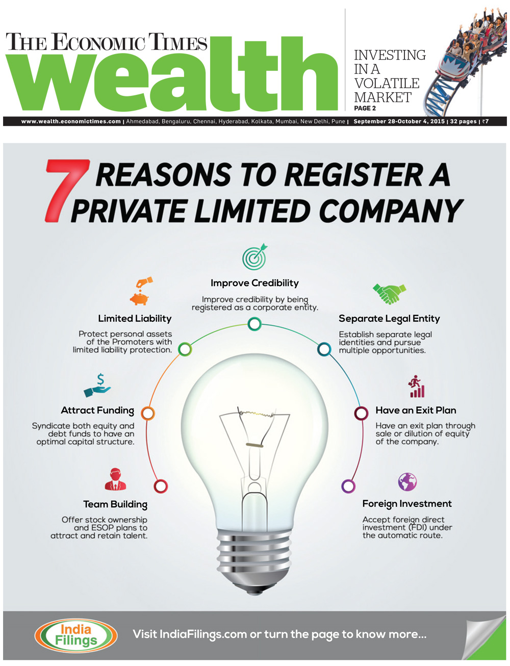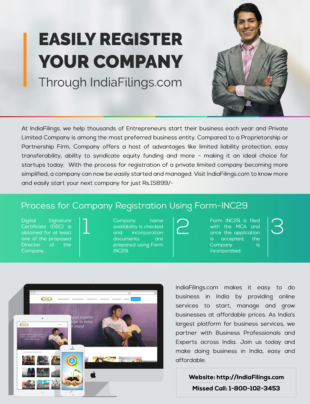 At IndiaFilings, we help thousands of entrepreneurs start their business each year and Private Limited Company is among the most preferred business entity. Compared to a Proprietorship or Partnership Firm, Company offers a host of advantages like limited liability protection, easy transferability, ability to syndicate equity funding and more - making it an ideal choice for startups today. With the process for registration of a private limited company becoming more simplified, a company can now be easily started and managed. Visit IndiaFilings.com to know more and easily start your company for just Rs.15899/-.