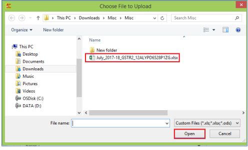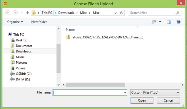 Step 2: Browse and select the downloaded GST return file (zip format) and click on the Open button.