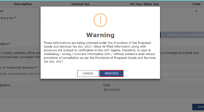 Step 26: The balance shown in the Electronic Cash Ledger should be more than or equal to the balances in the sum of amounts specified in Section 8 - Stock of purchases made from the Unregistered applicant under the existing law, (VAT + Central Excise + Service Tax) (If applicable).