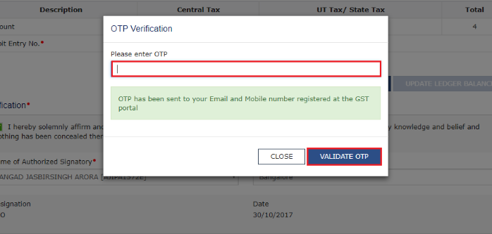 - Enter the OTP that is sent to an email address and mobile number of the Authorized Signatory registered at the GST Portal and to validate OTP, click the Validate OTP button.