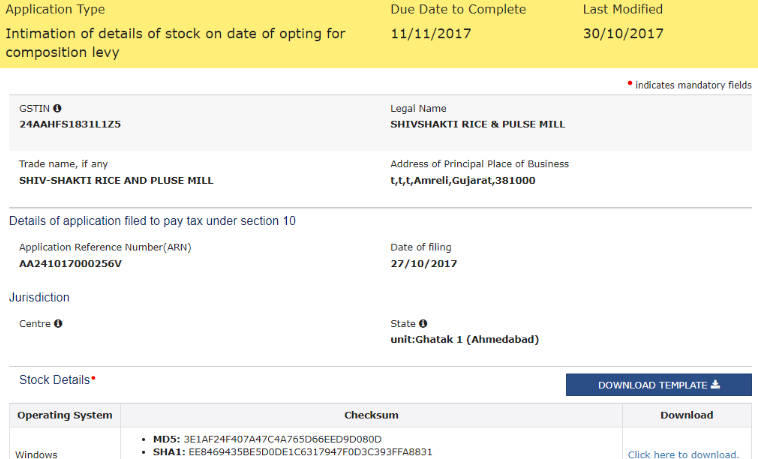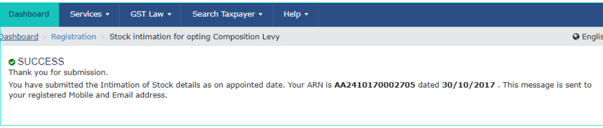 Note: If this GST CMP-03 has been filed once for the same financial year by the same GSTIN, then the option to file âStock Intimation for Opting Composition Levyâ form will not be available in the portal.