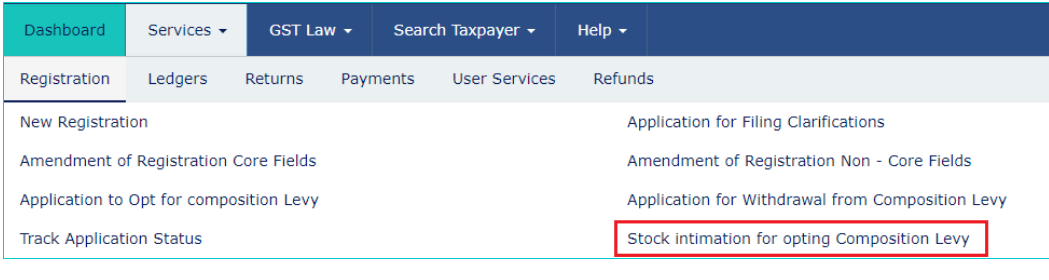 Step 4: After logging in, select âStock Intimation for opting Composition Levyâ from the Registration Menu under the service tab that is visible on the home page.