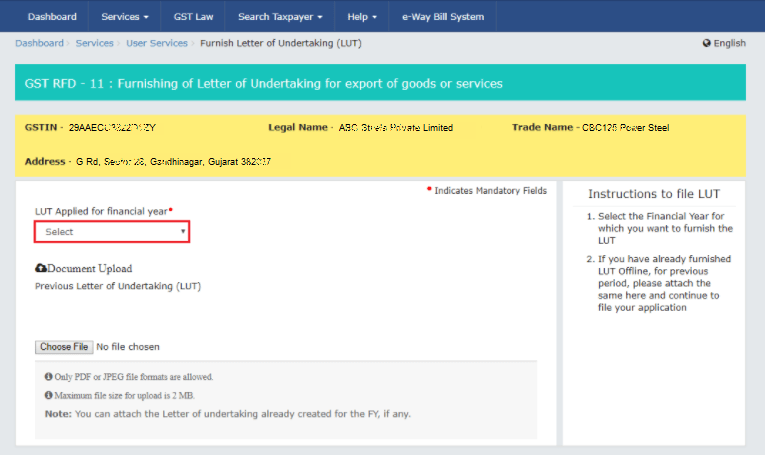 - Step 4: From the LUT Applied for Financial Year drop-down list, choose the financial year for which LUT is being used.