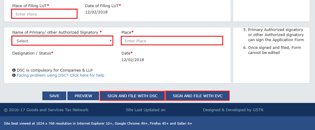 - Step 11: Submit with DSC: Sign the application with the authorized signatory's registered Digital Signature Certificate. To take advantage of this feature, go to 'SIGN AND FILE WITH DSC' > 'SIGN AND FILE WITH DSC' > 'SIGN AND FILE WITH DSC' A message box with a warning appears. 'PROCEED'>Â A one-of-a-kind ARN is generated by the system (Application reference number) (OR)