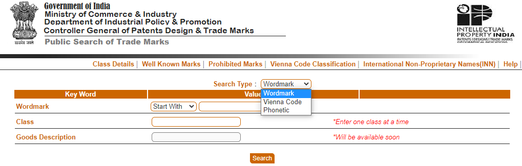 - Under ‘Search Type’, there are 3 options available; ‘Wordmark, ‘Vienna Code’, and ‘Phonetic’. You may choose which type of search you wish to do for your trademark.