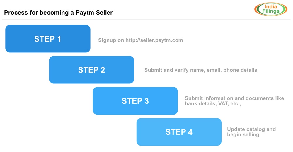 Step 1: Go to Paytm seller registration. Step 2: Provide your name, phone, email and choose a password for the account. Step 3: Complete the email verification process. Step 4: Complete the mobile number verification process. Step 5: Update business information and address. Step 6: Provide KYC Documents (More on this below) Step 7: Approve the terms and conditions. Step 8: Update your catalog of products Step 9: Begin selling on PaytmDocuments required for Paytm seller registration