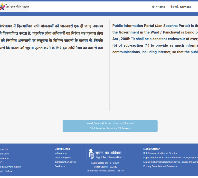 The Jan Soochna Portal aims for strengthening the democracy of India and Development of the State, Citizen Services Portal and the Workflow Management & Content Management platform to various schemes and services. This portal is operated by the Department of Information Technology, which will serve as nodal department for this portal. The portal aims to form a streamlined system for public information to prevent anomalies and corruption.Services Provided at Jan Soochna Portal