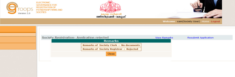 If your application is rejected, it will appear on the society account along with the remarks statement. You can view the remarks by clicking on the âview remarksâ button. After rectifying the defect firm user can resubmit the application to the office of the society registrar.
