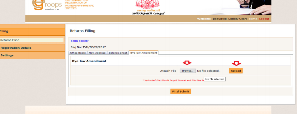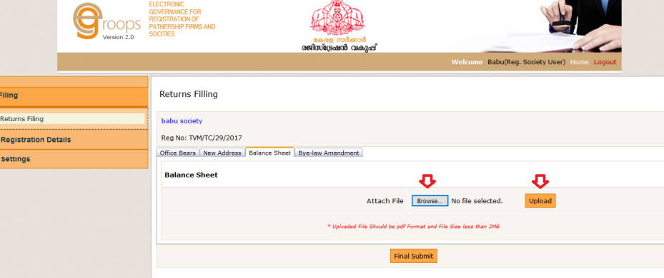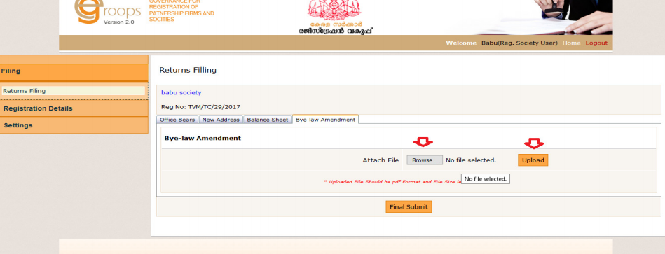 Step 5: For Returns Filings, it is mandatory to upload the balance sheet and bye-law amendments (Uploaded file should be in pdf format with size below 2 MB).