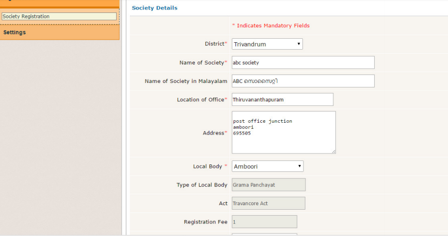 Step 2 - Kerala Society Registration