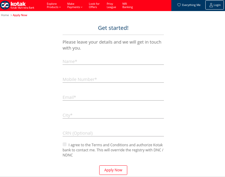 Kotak bank, The applicant can directly visit the branch or fill an online application form. Make the application form with the necessary details such as applicant name, contact number, email id, CRN number and submit your application by clicking the “Apply” button. The concerned branch will verify the documents and details provided for processing your loan application.