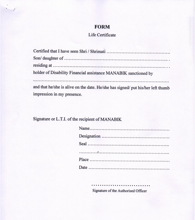 Step 1: The application form can be acquired either directly from Office of the Block Development Officer or the Executive Officer (if the applicant resides in a rural area) of the concerned Panchayat Samity or from the office of the Sub-Divisional Officer (if the applicant resides in a Municipal corporation). Alternatively, the application form can also be obtained by downloading the copy provided below. Step 2: The filled application must be addressed to the District Magistrate of the concerned District enclosed with the prescribed documents. Step 3: The Block Development Officer or the Sub-Divisional Officer verify all the applications based on the serial number and will cause an enquiry through an authorized officer relevant. Note: Priority in enquiry and sanction will be given for the applicants who suffer from any terminal disease. Step 4: The Manabik pension will be sanctioned by the District Magistrate of the concerning district who is the sanctioning authority. Step 5: The sanctioned payment will be transferred to the beneficiary’s bank account. In case of change of address, information pertaining to it should be intimated to the District Magistrate within a month. On the occurrence of the death of the recipient, the amount due until the date of death will be handed over to the heir of the deceased recipient after verification. The fund provided will be withheld thereafter.Life Certificate