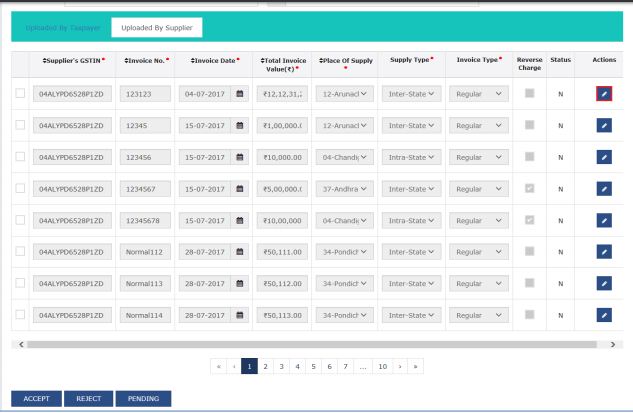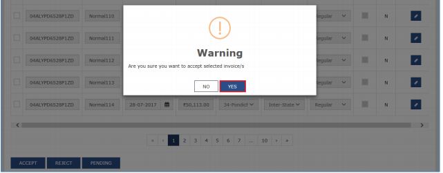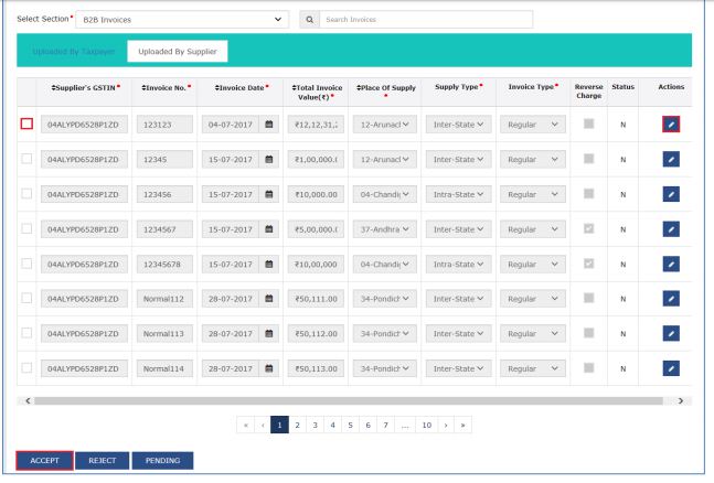 To accept the invoice, select the checkbox against the invoice and click on the Accept option. You can verify and edit the system-calculated ITC details. By default, the system marks B2B invoices as inputs with ITC equal to the tax paid for ITC-eligible invoices.
