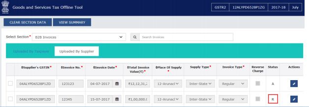 The Select section details tab appears. To view and edit the details or records at the rate level, click the edit button and move to the rate level records. You can modify the total invoice value, taxable value and rates.