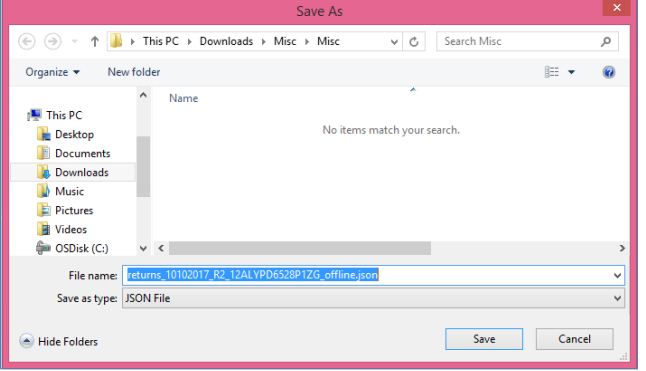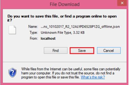 Step 6: The GST-compliant file generated by the GST Returns Offline tool (JSON format) will have to be saved on the computer to upload the same to the GST portal. Click the Save button.