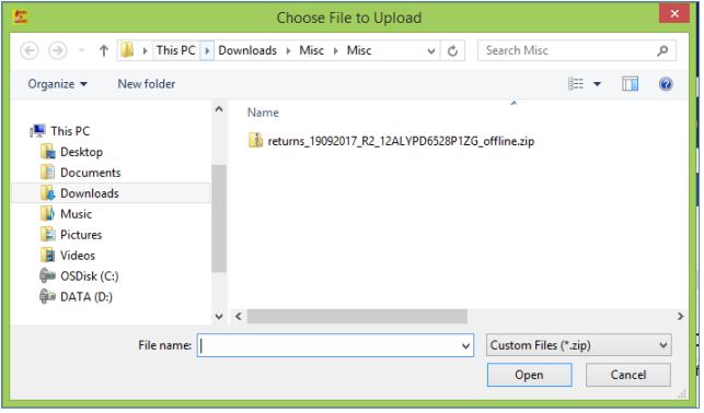 Step 11: Browse and select the downloaded return file in zip format and click on the open button.