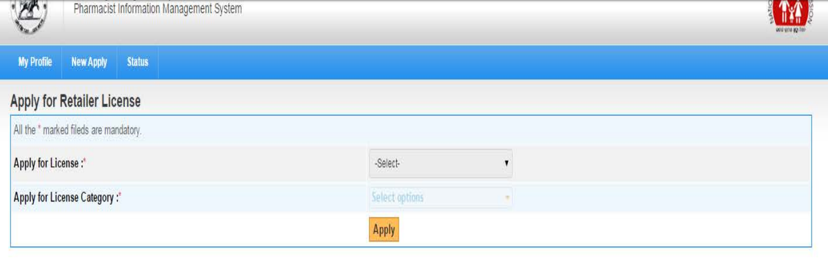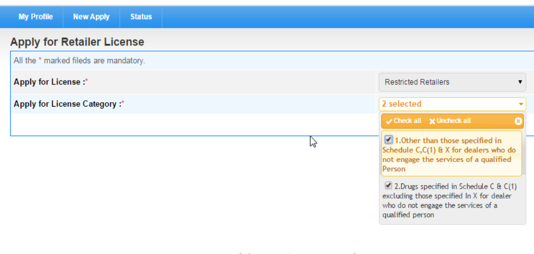 Step 11: In this page, select the Apply for License (Retailers /Restricted Retailers/ Homeopathic Retailers).