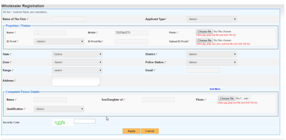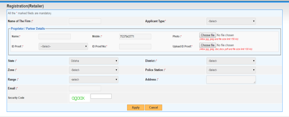 Step 7: After completing the above process, the Retailer registration form will be displayed on the screen. The applicantâs name and the mobile number will be prefilled. Now you have to fill the following information in the form.- Name of the firm