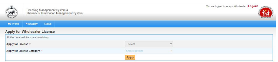 Step 21: In this page, select the Apply for License (Wholesalers, Wholesaler Motor Vehicle, Homeopathic Wholesalers).