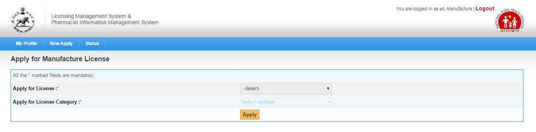 Step 30: In this page, select the Apply for License (Allopathy, Homeopathy, Cosmetic, Blood Bank).
