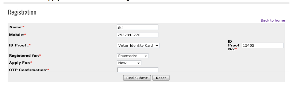 Step 5: After clicking on the Submit Button, you will get a confirmation Code on your registered mobile number. Then you have to put that received code in the Confirmation box and click on âFinal Submitâ button, which will direct you to the registration page for Retailer/ Wholesaler/ Manufacturer/ Pharmacist.