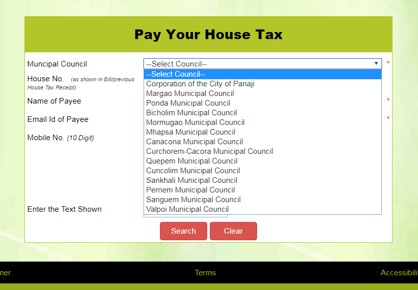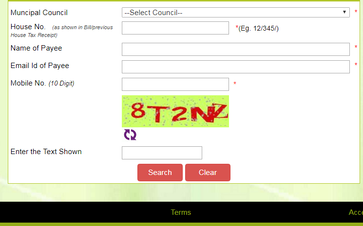 Step 4: After filling all the requested details, enter the captcha as shown. Then click on the “Search” option. Then, you will be directed to the property tax payment gateway.
