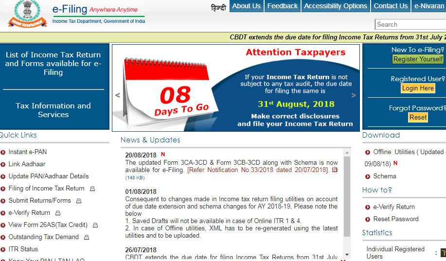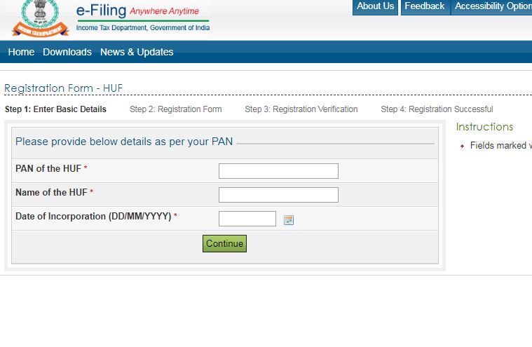 Step 3: Go to the ‘e-Filing’ Portal. Step 4: Click on "Register Yourself" in the menu bar. Step 5: Select the user type as Individual or HUF or Other than Individual and HUF and click on the "Continue" button.