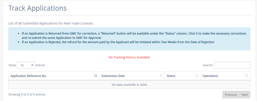 - If an application is returned from GMC for correction, a "Returned" button will be available under the "Status" column. Click it to make the necessary corrections and re-submit the same Application to GMC for Approval. If an Application is rejected, the refund for the amount paid by the Applicant will be initiated within Two Weeks from the Date of Rejection.