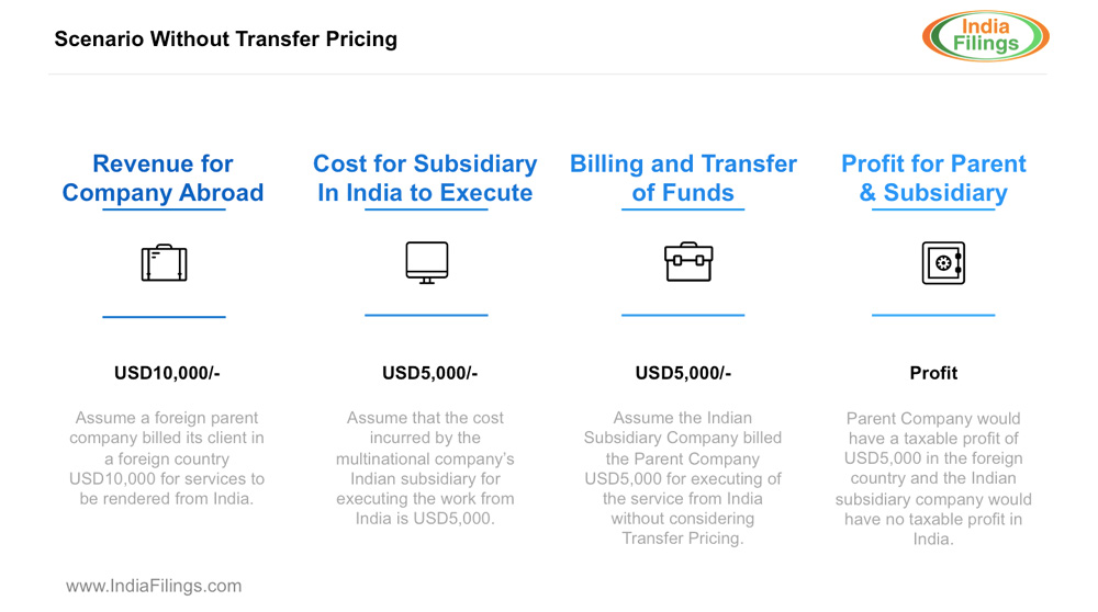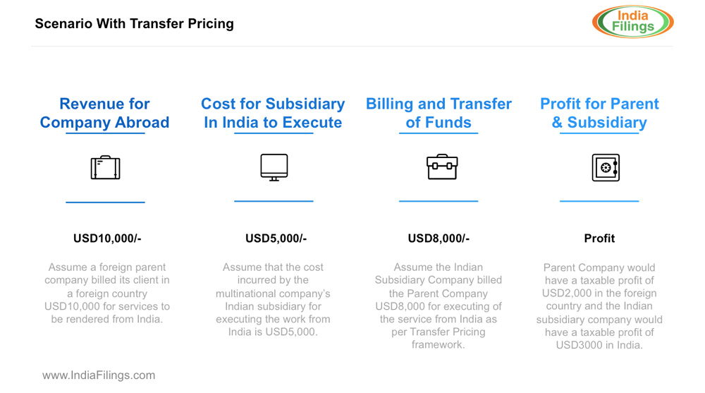 In the above scenario without transfer pricing, the parent company abroad would pay taxes on USD5000, whereas the Indian subsidiary company would pay no taxes. Hence, a scenario without transfer pricing mechanism could lead to revenue loss and also a drain on foreign exchange reserves.