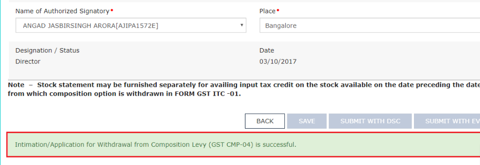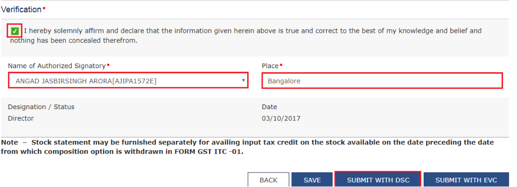 Step 12: Upon selecting the Authorized Signatory and the Place, only then the options to submit the form will get activated. Step 13: Sign the form by using either the Digital Signature Certificate (DSC) or the EVC option. On selecting any of these below options, OTP will be received.