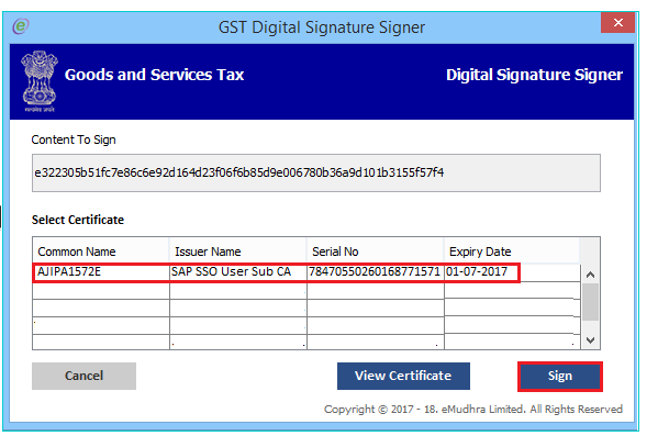 Step 17: The system will retrieve the installed digital signatures available using the emSigner, and a pop-up message to select the desired DSC. Select the desired signature to receive the confirmation message.