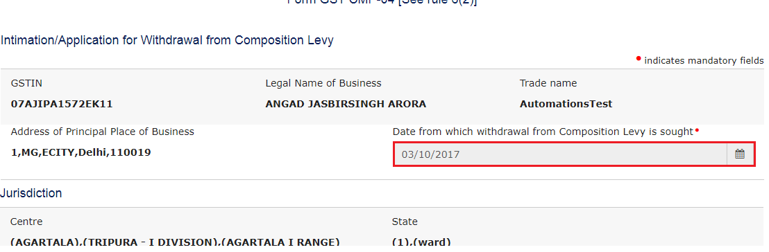 Step 6: Select the date from which the withdrawal from Composition Levy is sought using the calendar.